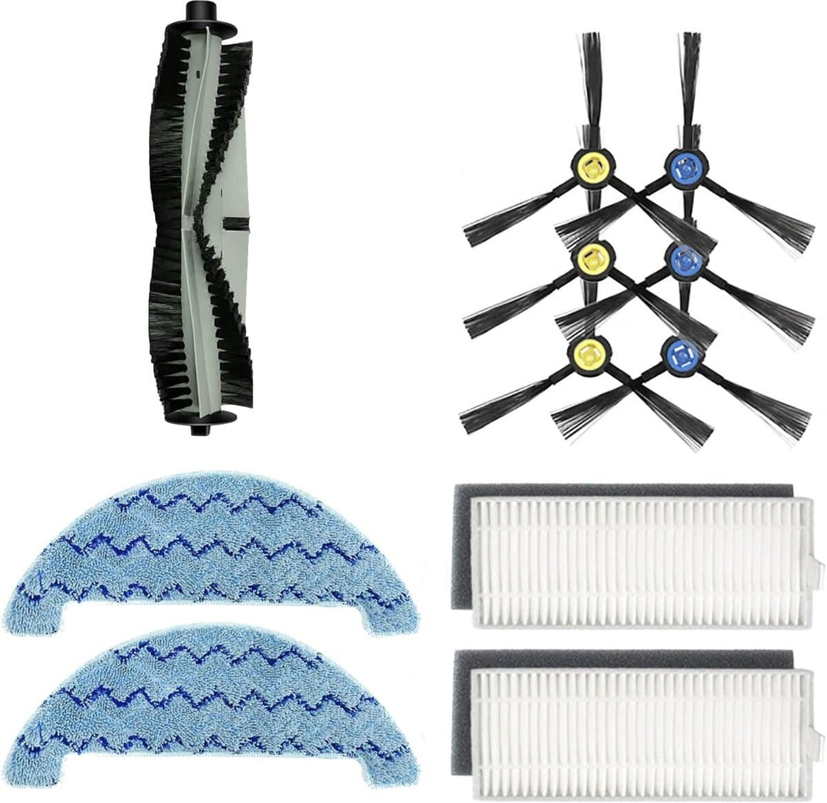 De accessoireset bevat: 1 * hoofdborstel + 3 paar zijborstels + 2 * filters + 2 dweilpads