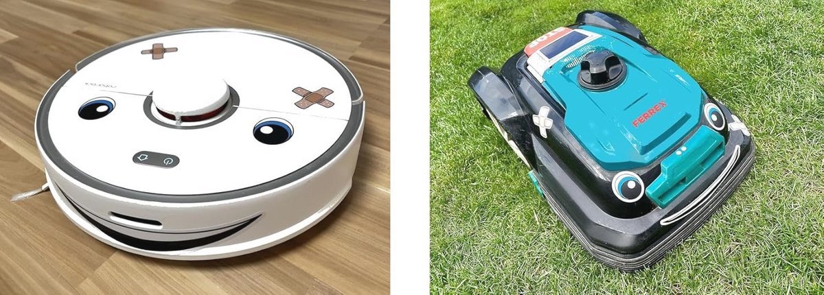 Met deze decoratieve stickerset geef je jouw robotstofzuiger, robotmaaier of dweilrobot een persoonlijke uitstraling. Deze set bevat 2 ogen, een mond en twee pleisters die eenvoudig op verschillende apparaten kunnen worden aangebracht. Een leuk accent terwijl de robot zijn werk doet! Gemaakt van hoogwaardige, waterdichte materialen en bestand tegen UV-straling, blijven de stickers tot 7 jaar mooi, zelfs buiten. Afmetingen: ogen: ca. 5 x 4,5 cm; mond: ca. 3 x 20 cm; pleister: ca. 5 x 5,5 cm.
