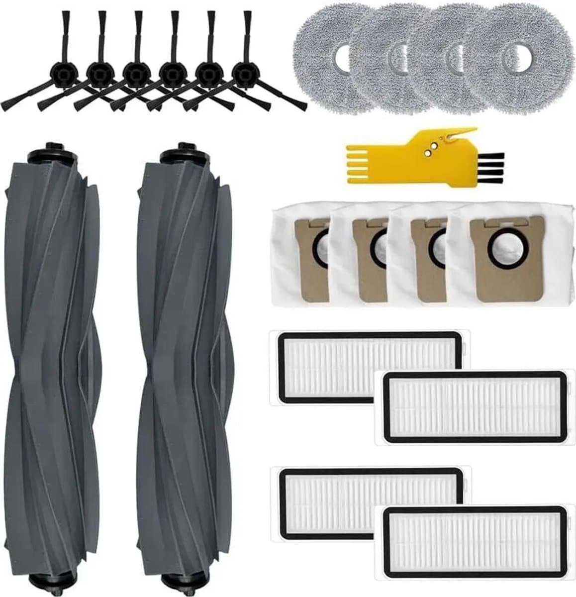 Deze accessoirekit Geschikt voor Dreame L20 Ultra robotstofzuiger bevat 20 reserveonderdelen: 2 rolborstels, 4 filters, 6 zijborstels, 4 dweilpads en 4 stofzakken.