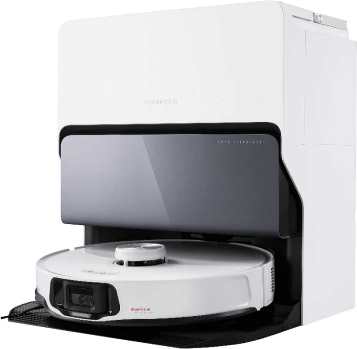 Slim dock-station: RockDock Ultra 8-in-1 – dit station zorgt voor leegmaken van de stofbak, automatisch dweil wassen met heet water (~60°C), drogen met warme lucht, bijvullen van water en dosering van schoonmaakmiddel. Robostofzuigers.nl+1