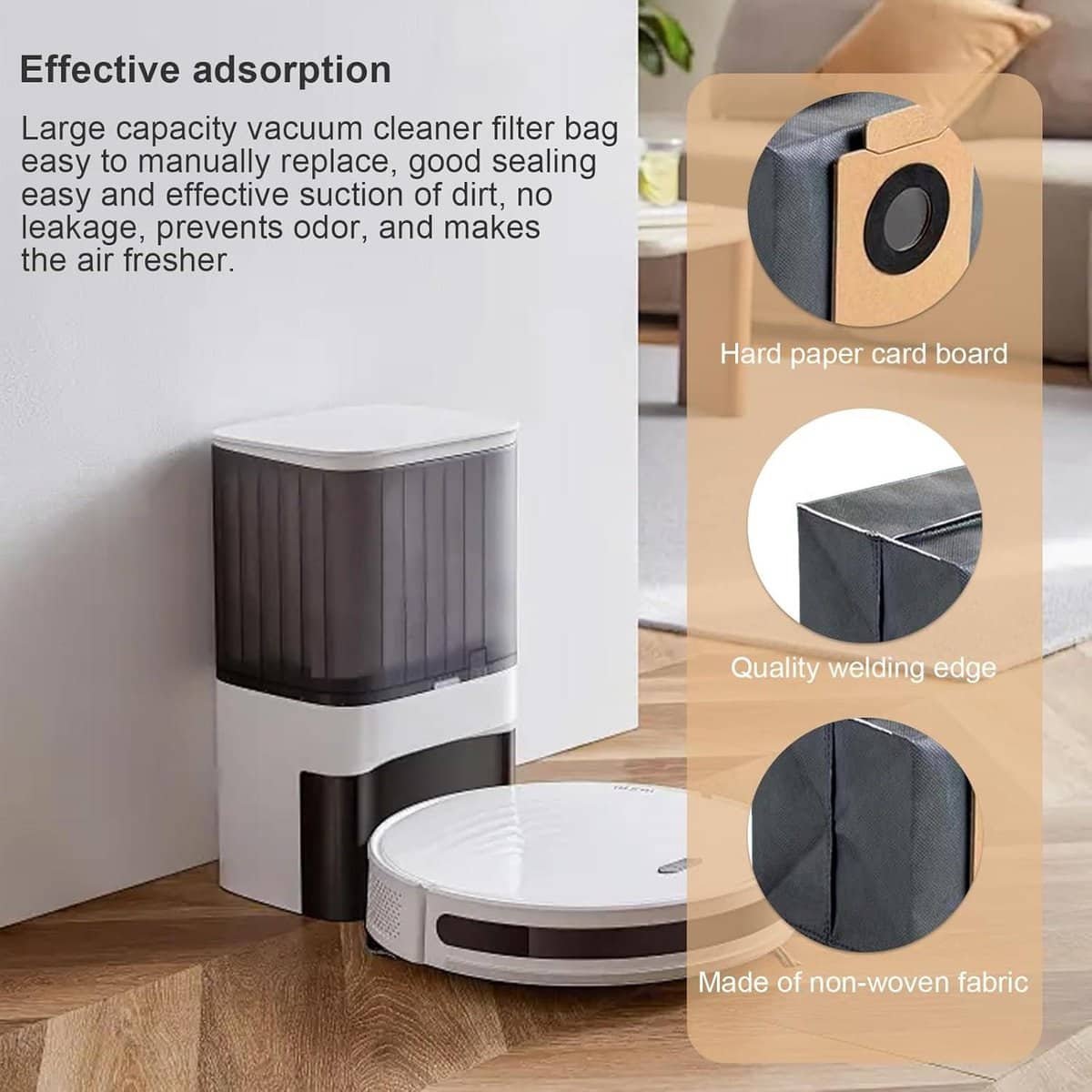 Ervaar de gemakken van de grote capaciteit van de stofzakken, met afmetingen van 16 x 13 x 13 cm. Je hoeft ze minder vaak te vervangen, waardoor ze tot wel 60 dagen meegaan bij regelmatig gebruik. Hierdoor bespaar je tijd en energie en geniet je langer van een schone omgeving.