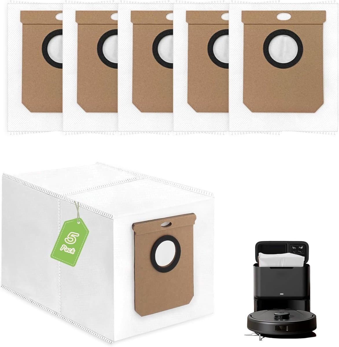 Vervangende stofzakken voor uw robotstofzuiger. Set van 5 stofzakken, geschikt voor het opvangen van stof en vuil. Eenvoudig te installeren en ideaal voor routineonderhoud.
