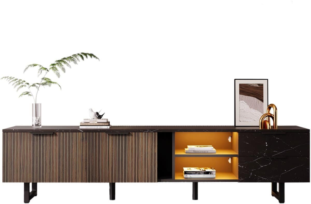 Dit luxe TV-meubel van 200 cm combineert een verfijnde zwarte marmerlook met natuurlijke donkere houtnerven en is voorzien van instelbare LED-verlichting. Het biedt een perfecte balans tussen modern design en praktische opbergruimte voor een stijlvol en georganiseerd interieur.