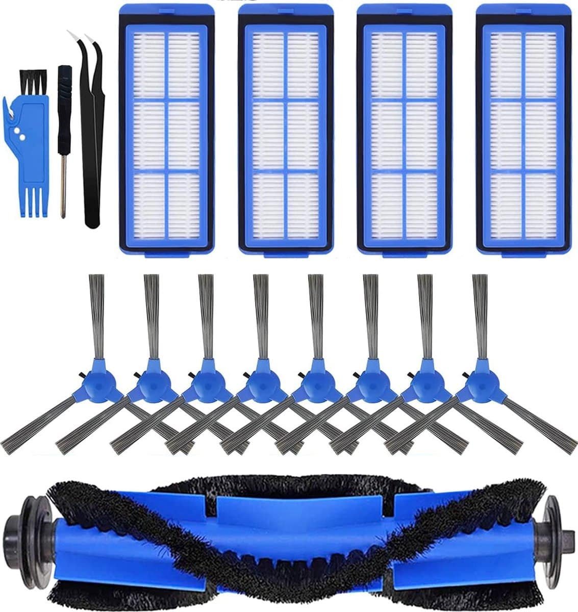Pakket bevat: 1 x hoofdborstel, 8 x zijborstel, 4 x HEPA-filters, 1 reinigingsborstel, 1 x pincet, 1 x schroevendraaier. Als de zijborstels door verzending zijn gebogen, kunt u ze herstellen door ze een tijdje in warm water te weken.